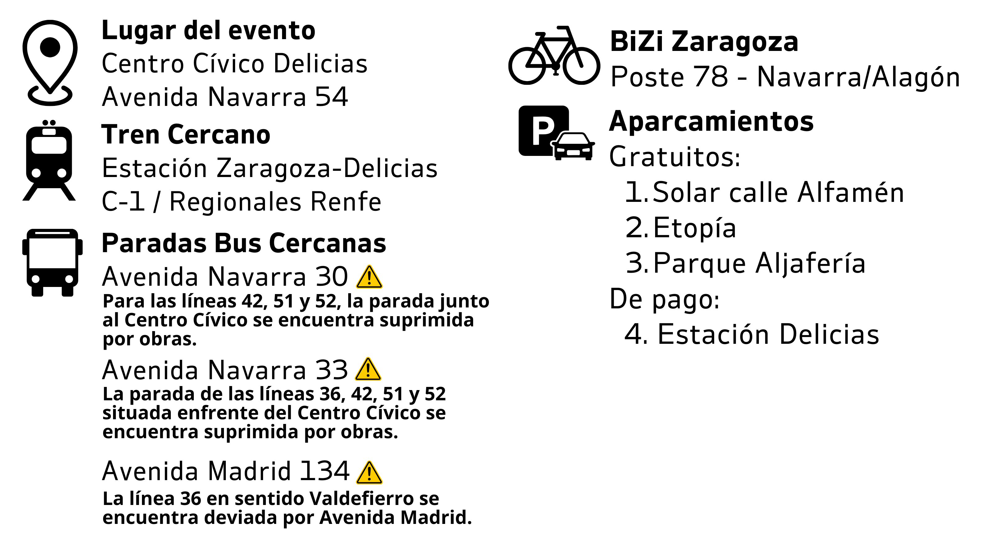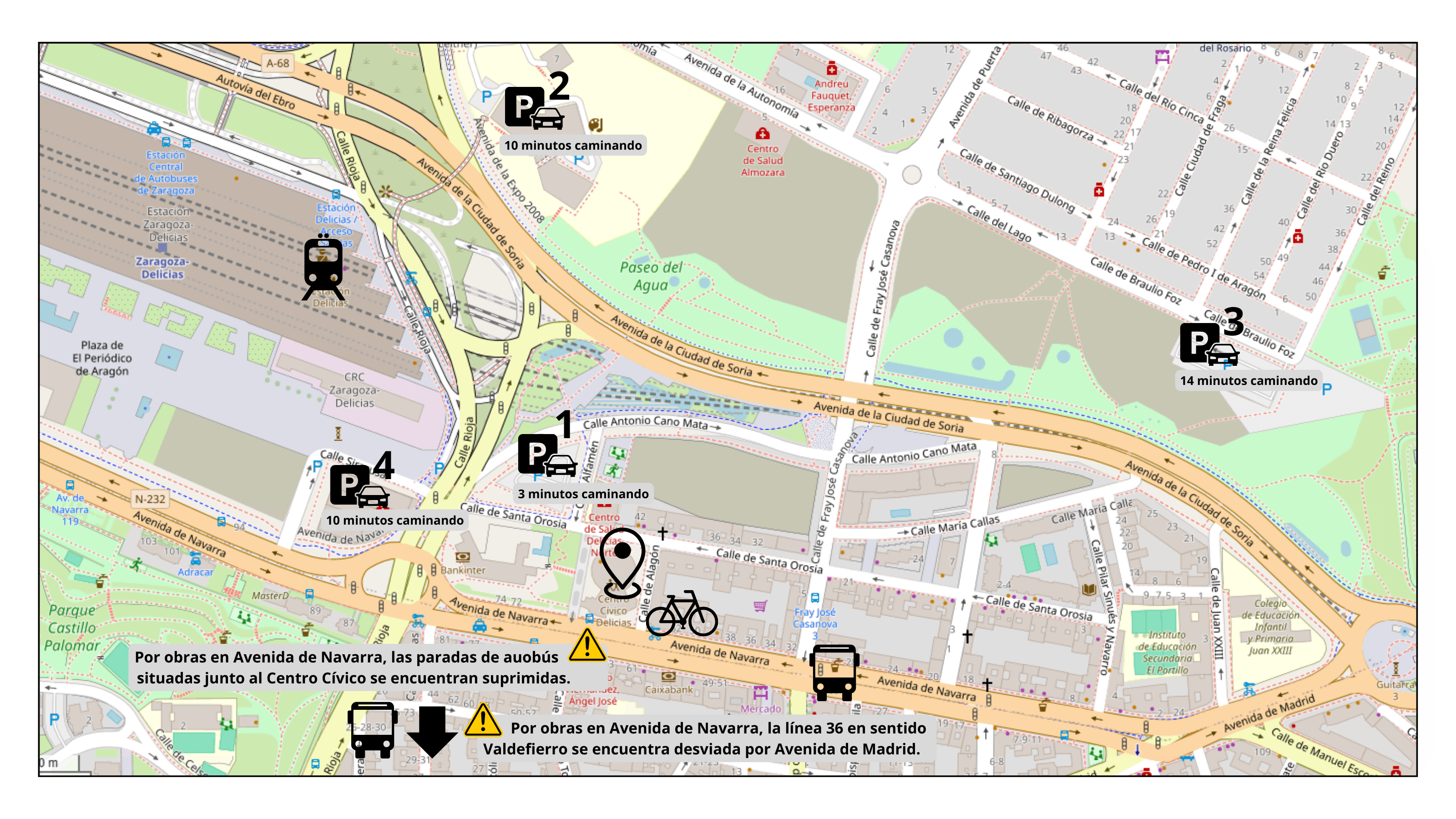 Si llegas en autobús, debes saber que la Avenida de Navarra se encuentra en obras, por lo que las paradas en cada sentido ubicadas junto al Centro Cívico están suprimidas. Las líneas 42, 51 y 52 realizan su recorrido habitual y las paradas más cercanas son las de Avenida de Navarra 30 y Avenida de Navarra 33. La línea 36, sin embargo, se encuentra desviada por Avenida de Madrid en sentido Valdefierro, por lo que la parada más cercana se ubica en Avenida de Madrid 134, en esquina con la calle Rioja. En sentido Picarral, la línea 36 realiza su recorrido habitual por Avenida de Navarra, siendo la parada operativa más cercana la ubicada en Avenida de Navarra 33.